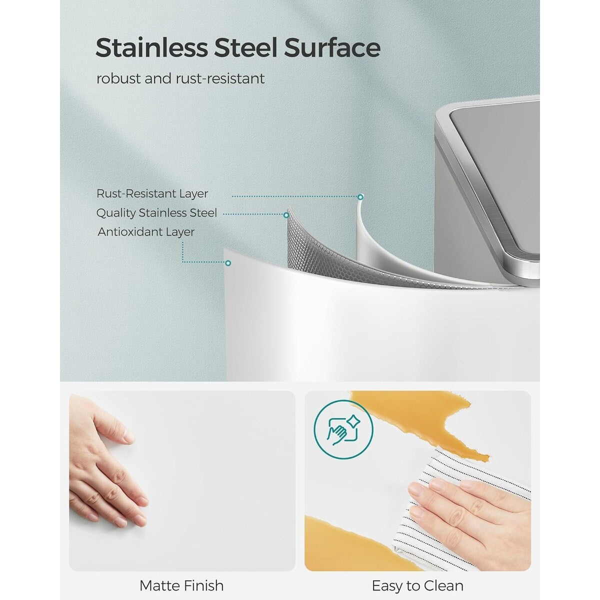 - Matériau : Poubelle en acier inoxydable avec revêtement en poudre, seau intérieur en plastique PP, couvercle en plastique ABS