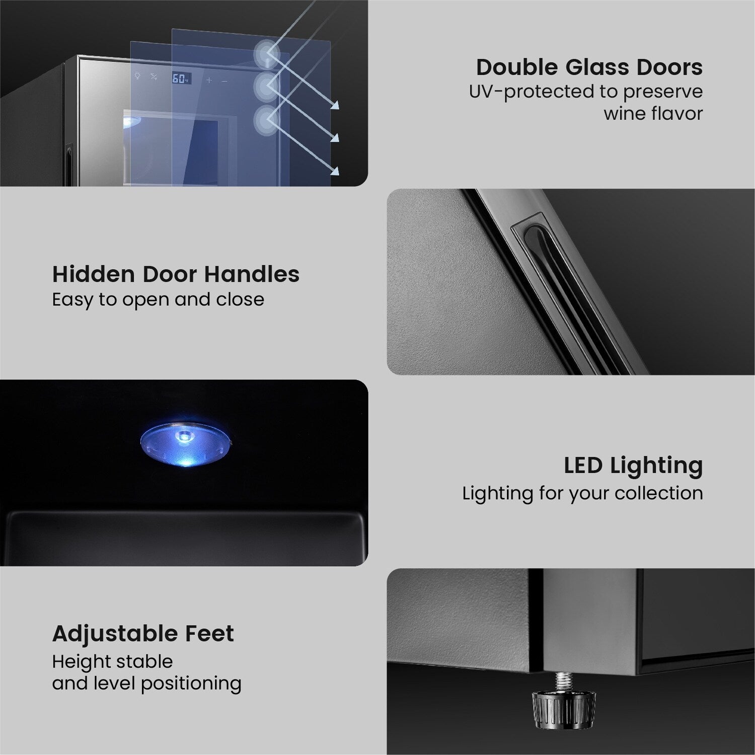 - Fonctionnement silencieux : fonctionne avec des niveaux de vibrations et de bruit minimes, offrant un environnement tranquille pour que vos vins vieillissent gracieusement.
