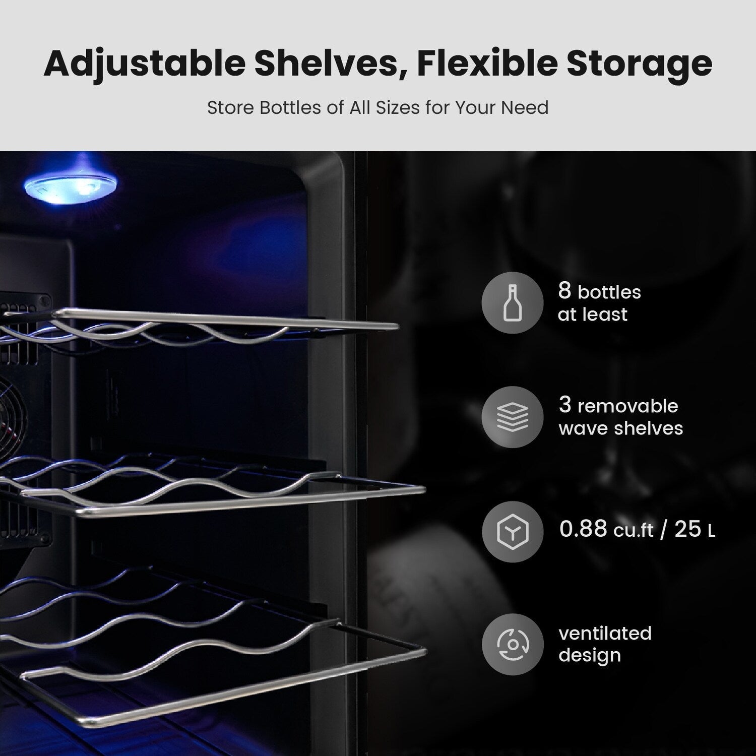 - Rangement polyvalent : peut accueillir 8 bouteilles de Bordeaux standard de 750 ml avec trois casiers à vin amovibles, permettant une flexibilité pour différentes tailles et types de bouteilles.